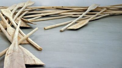 Vor den Chorstufen zieht die titelgebende Installation „Treibholz“, 34 große hölzerne Ruder, gesägt aus einem einzigen großen Pappelstamm, den Blick an. Es geht um Wandlung. Die Transformation der Fließkraft des Wassers erzählt zwei Geschichten. Zum einen die der Menschen, die das Ruder führen: ihre Mühe, ihre Synchronisation zum Erreichen eines gemeinsamen Ziels, ihr Rhythmus.